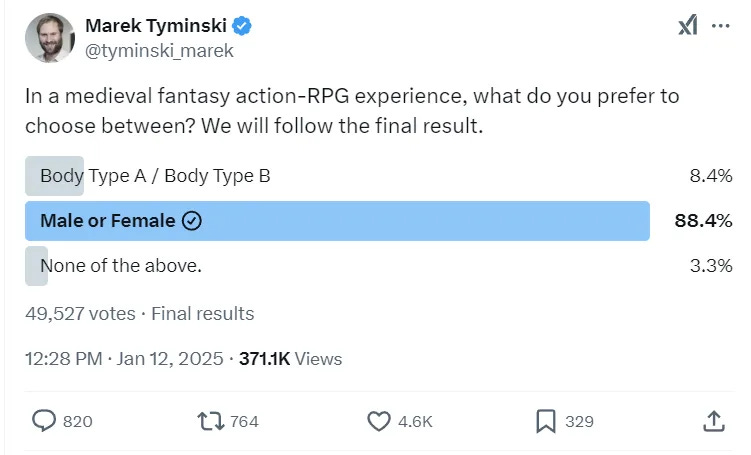Earlier this month, Tyminksi polled his followers on X and asked, “In a medieval fantasy action-RPG experience, what do you prefer to choose between? We will follow the final result.”