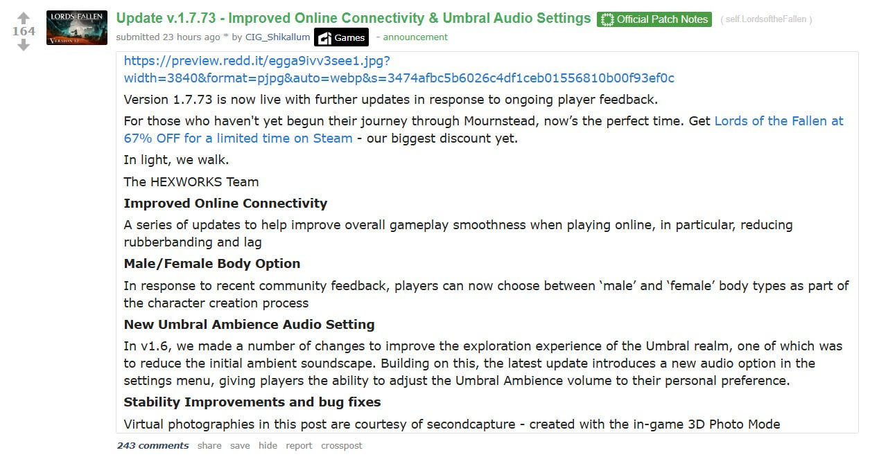 The patch notes, which were shared to the game’s subreddit state, “Male/Female Body Option: In response to recent community feedback, players can now choose between ‘male’ and ‘female’ body types as part of the character creation process.”