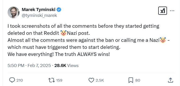He wrote, “I took screenshots of all the comments before they started getting deleted on that Reddit Nazi post. Almost all the comments were against the ban or calling me a Nazi, which must have triggered them to start deleting.”