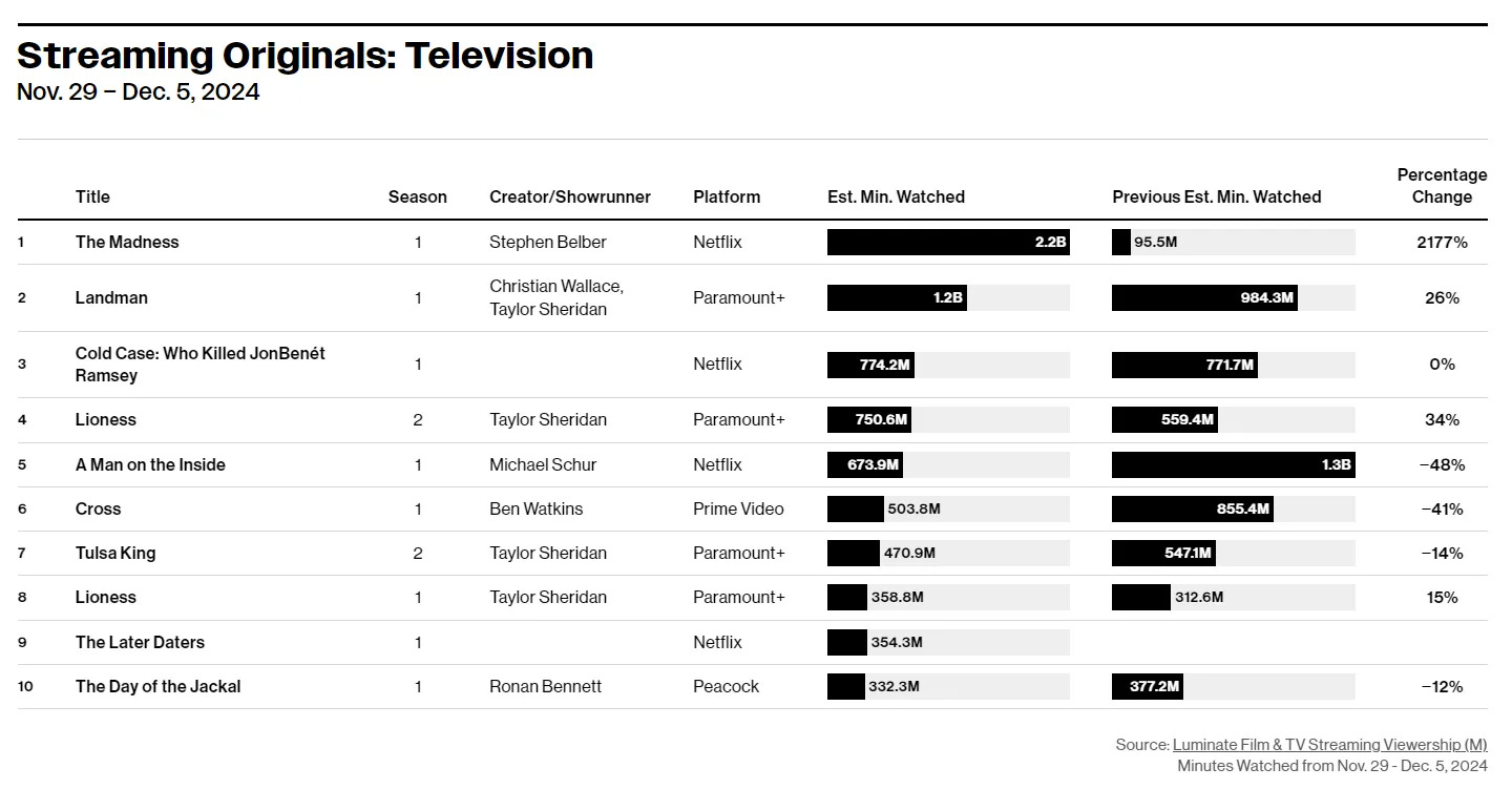 However, that number increased in the show’s second week to 380.5 million minutes watched. It vaulted the show to sixth on Luminate’s chart.