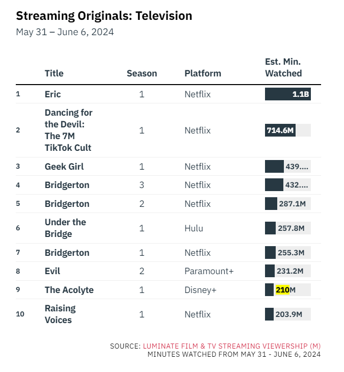 The Acolyte brought in 210 million minutes watched in its first week when it had its two-episode premiere back at the beginning of June. That was good enough for 9th on Luminate’s chart for the week.
