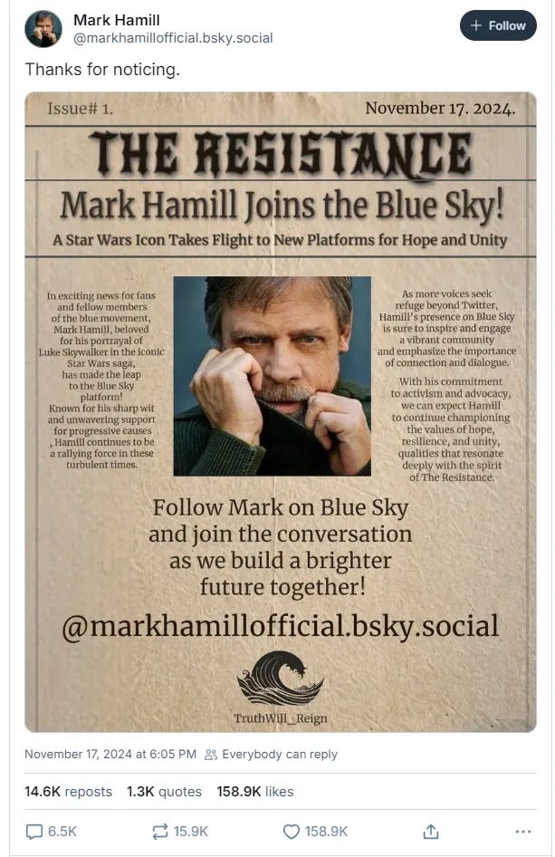 After the election, however, Hamill followed the trend of many Hollywood celebrities, blaming X for the election of Donald Trump and Elon Musk by proxy, and he virtue signaled by saying he was going to leave X for BlueSky, saying, “Now that I've fled Leon's site for bluer skies, I'm sure I'll be called an Ex-X, but personally, I'll always consider myself a #TwitterQuitter.”