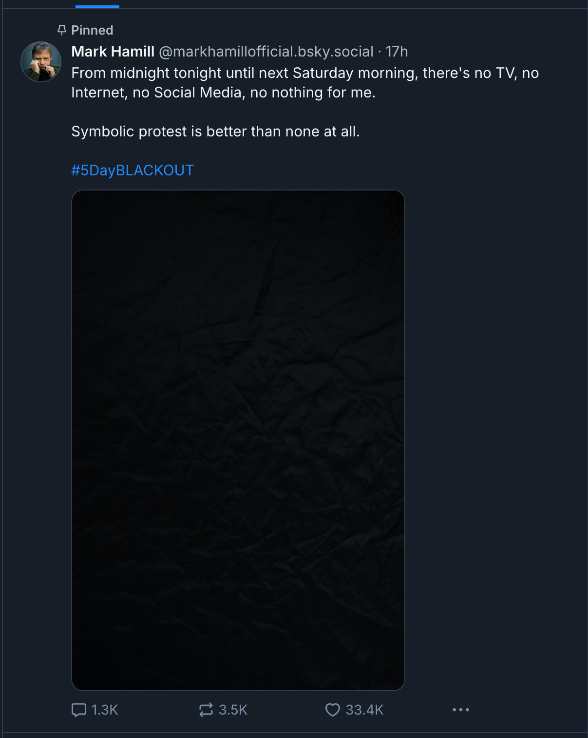 Yesterday, however, Mark Hamill announced he would be making a new pointless protest on BlueSky, where he has significantly less followers and interaction. He said , “From midnight tonight until next Saturday morning, there's no TV, no Internet, no Social Media, no nothing for me. Symbolic protest is better than none at all. #5DayBLACKOUT,” which he posted along with an all-black image.