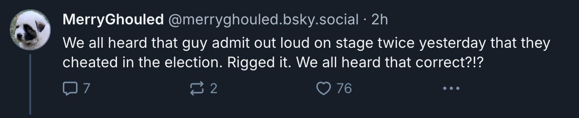 One of his followers immediately falsely claimed the 2024 election was rigged and stolen, saying, “We all heard that guy admit out loud on stage twice yesterday that they cheated in the election. Rigged it. We all heard that correct?!?”
