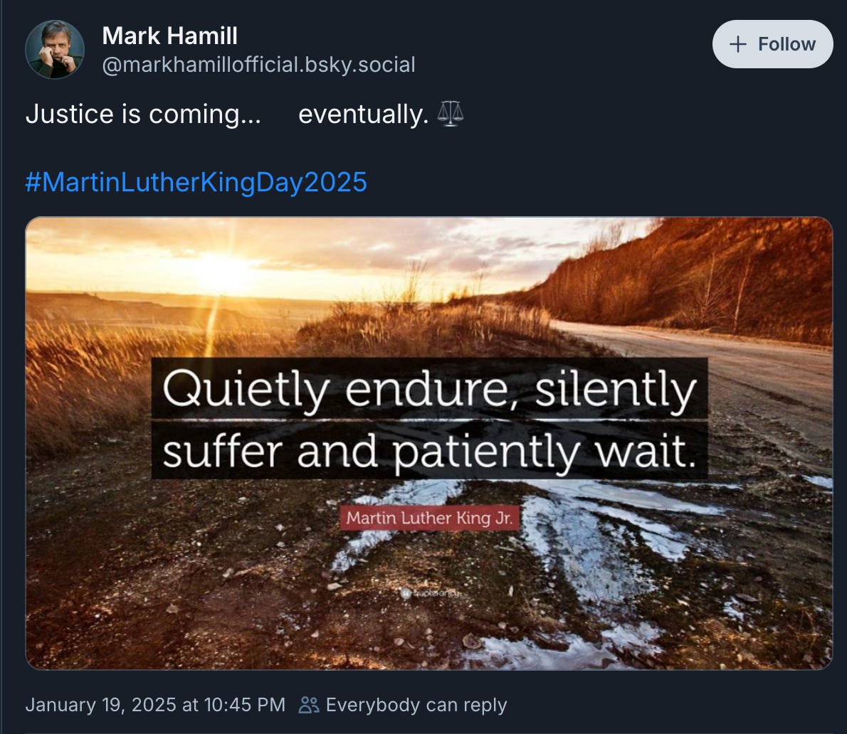 If he wasn’t sad enough in posting this, a mere eight hours later he broke his own social media promise of a symbolic protest by posting, making some ridiculous claim about “justice” coming. “Justice is coming... eventually. ⚖️ #MartinLutherKingDay2025”. He posted this with an image with a quote from Marin Luther King Jr. that said “Quietly endure, silently surfer and patiently wait.”