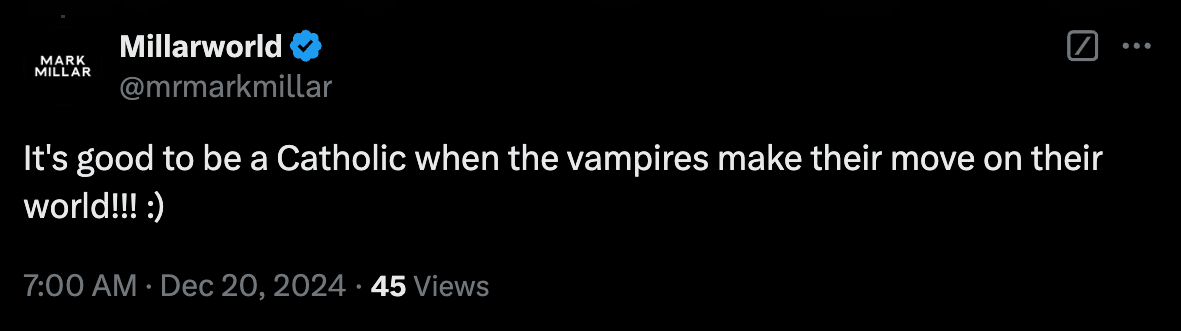 Talking about the book on X, Millar said, “It's good to be a Catholic when the vampires make their move on their world!!! :)”