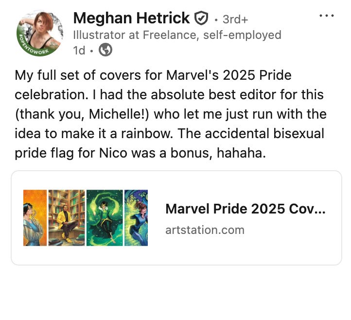 Hetrick said of the covers on her LinkedIn, “My full set of covers for Marvel's 2025 Pride celebration. I had the absolute best editor for this (thank you, Michelle!) who let me just run with the idea to make it a rainbow. The accidental bisexual pride flag for Nico was a bonus, hahaha.”