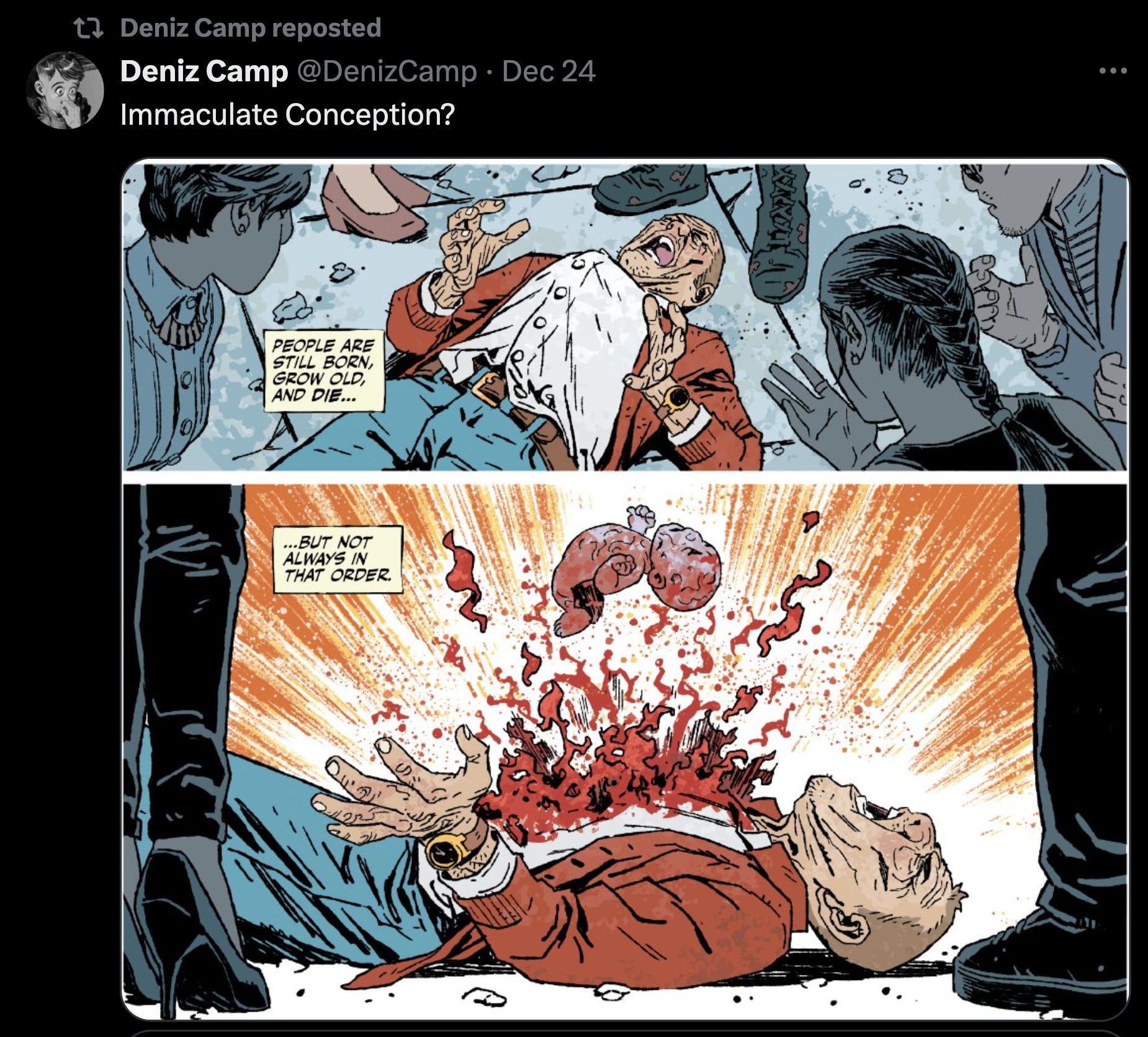 Undeterred by the blowback he’s received, Deniz Camp has decided to mock the Incarnation of Christ on Christmas Eve as a promotional post for one of his Image Comics projects.