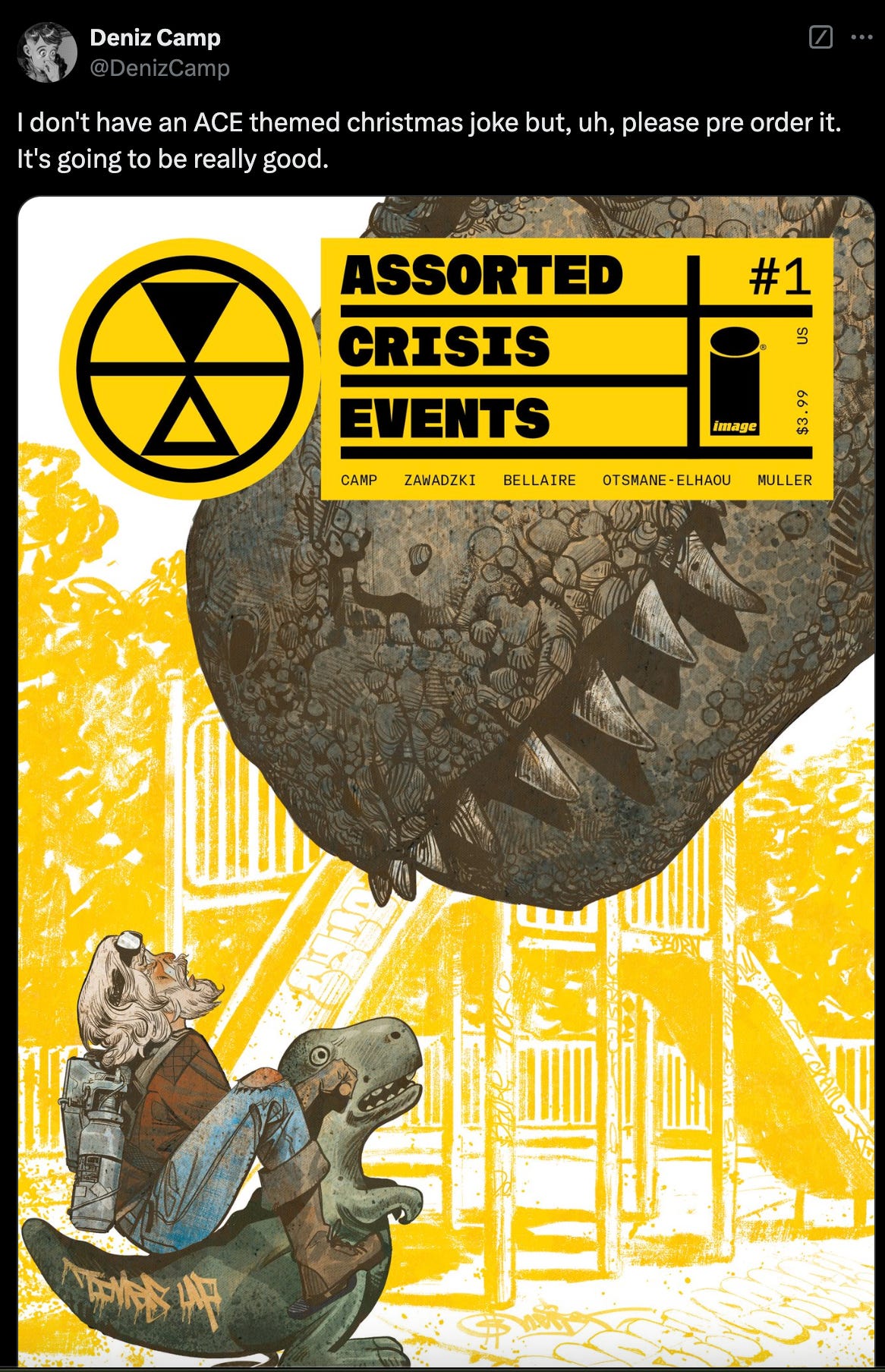 He first posted the cover of the book Assorted Crisis Events along with stating, “I don't have an ACE themed christmas joke but, uh, please pre order it. It's going to be really good.”
