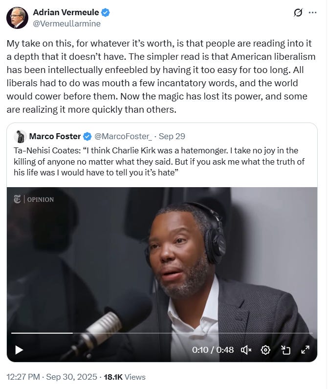 Harvard Law Professor Adrian Vermeule provided a proper reaction to Coates’ slander saying, “My take on this, for whatever it’s worth, is that people are reading into it a depth that it doesn’t have. The simpler read is that American liberalism has been intellectually enfeebled by having it too easy for too long. All liberals had to do was mouth a few incantatory words, and the world would cower before them. Now the magic has lost its power, and some are realizing it more quickly than others.”