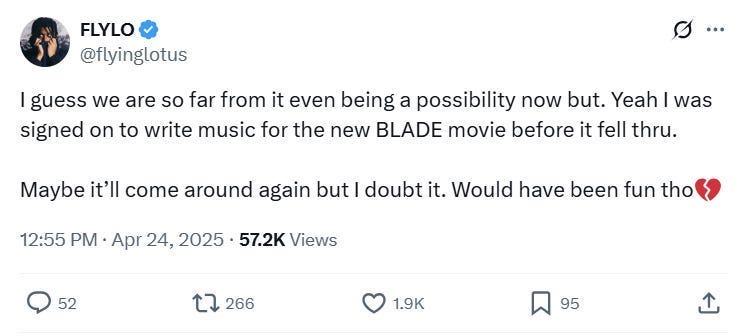 Then in April Steven Ellison aka Flying Lotus revealed he was signed on to write music for Marvel Studios’ Blade film, but shared that the film is unlikely to happen as the movie does not appear to be moving forward any time soon.