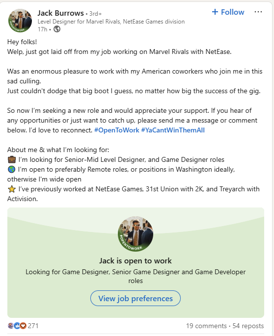 He wrote, “Hey folks! Welp, just got laid off from my job working on Marvel Rivals with NetEase. Was an enormous pleasure to work with my American coworkers who join me in this sad culling. Just couldn't dodge that big boot I guess, no matter how big the success of the gig.”