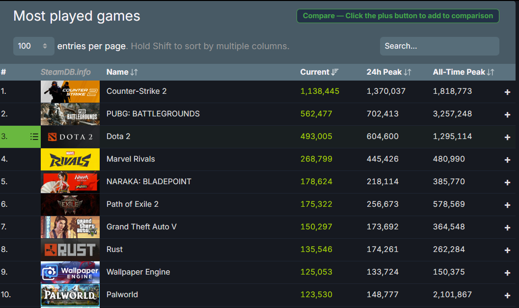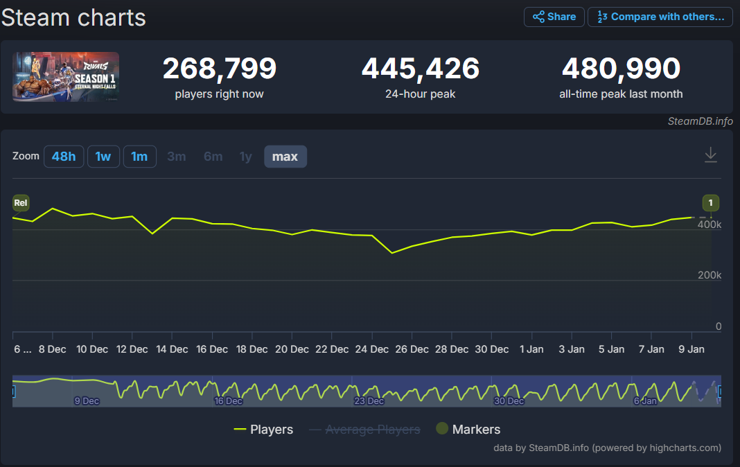 Marvel Rivals has consistently been one of the most played games since its launch in December. Currently the game is fourth in peak concurrent players in the last 24 hours as well as current active players. It’s only behind Counter-Strike 2, PUBG: Battlegrounds, and Dota 2.