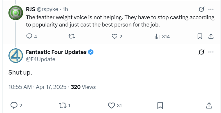 Fantastic Four shill account Fantastic Four Updates simply told one individual who did not like the casting of the female Silver Surfer and specifically criticized Garner’s voice to “Shut up.”