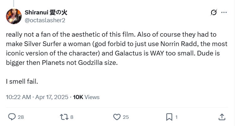 On X one individual wrote, “really not a fan of the aesthetic of this film. Also of course they had to make Silver Surfer a woman (god forbid to just use Norrin Radd, the most iconic version of the character) and Galactus is WAY too small. Dude is bigger then Planets not Godzilla size. I smell fail.”