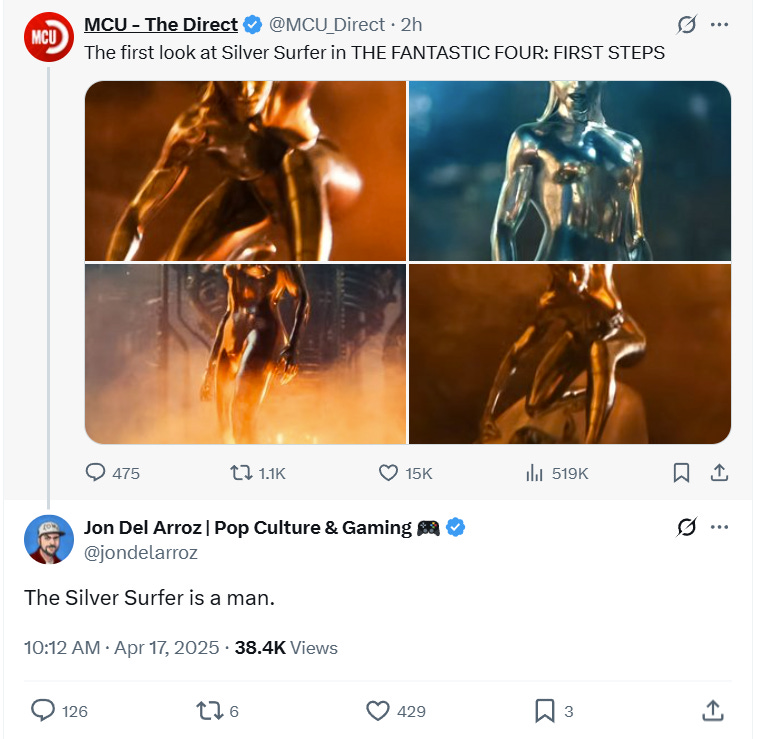 Fandom Pulse co-owner Jon Del Arroz replied to first look images of Garner’s Surfer writing, “The Silver Surfer is a man.”