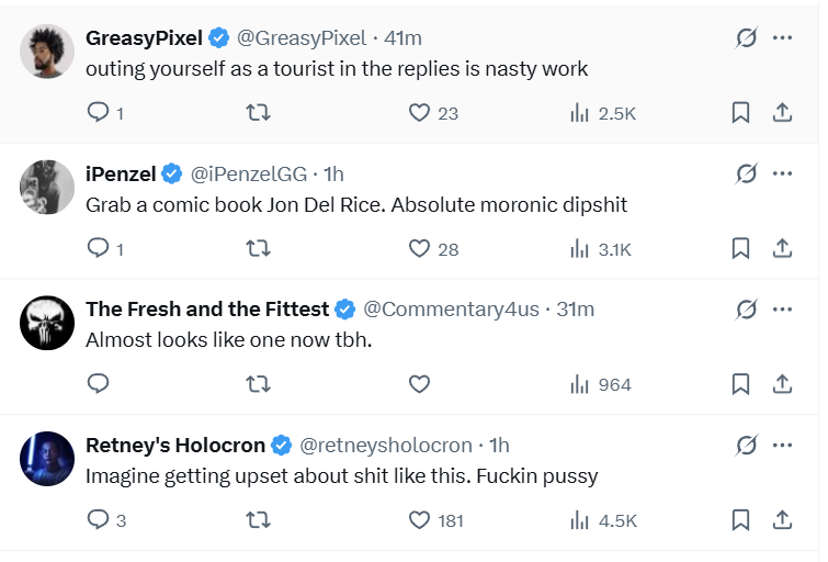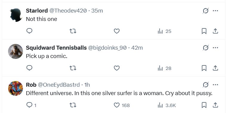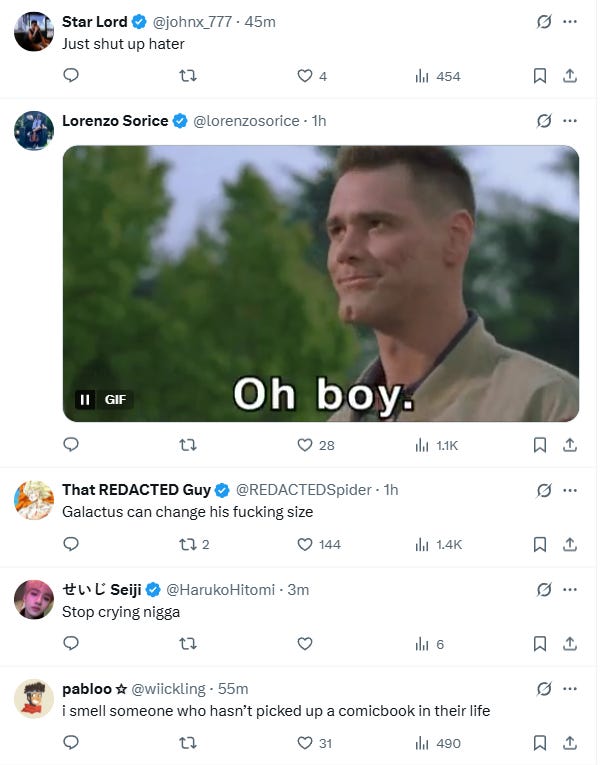 “Stop crying nigga,” responded another while one posted, “i smell someone who hasn’t picked up a comicbook in their life.”