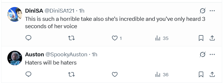 Others replied, “This is such a horrible take also she’s incredible and you’ve only heard 3 seconds of her voice” and “Haters will be haters.”