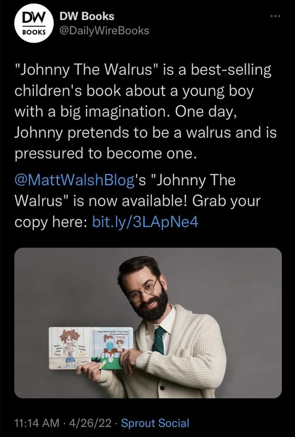Matt Walsh is right that these people are threatened over the most benign of speech, and they will try to shut anyone down with any means possible, in an insane story over this book. Until the left gets pushback, our children are in danger in all public schools of their indoctrination where anything, even a book with a Walrus, isn’t allowed to be present to question their narratives.