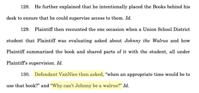 4/ The district says my story about a little boy, Johnny, pretending to be a Walrus constitutes a “hostile expression of animus” toward students’ “actual or perceived gender identity.” Theis was ordered to remove it or face termination.