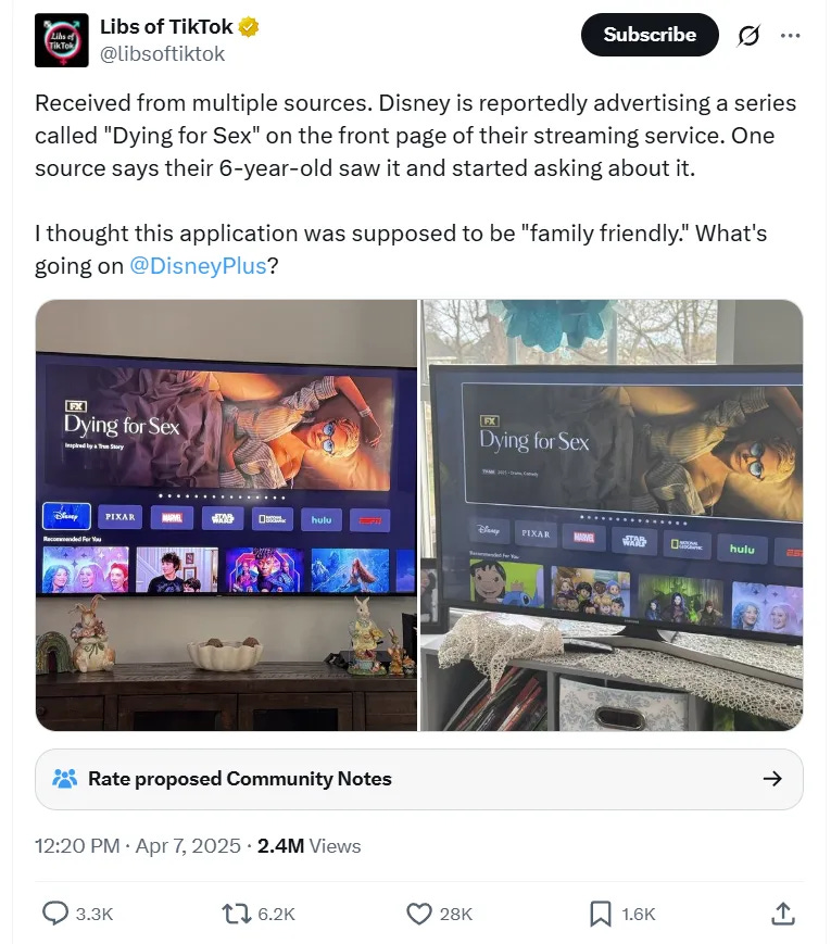 The show recently and rightfully came under fire after The Walt Disney Company advertised the show on the front page of its Disney+ streaming service. Popular X account LibsofTikTok questioned, “Received from multiple sources. Disney is reportedly advertising a series called Dying for Sex on the front page of their streaming service. One source says their 6-year-old saw it and started asking about it. I thought this application was supposed to be "family friendly." What's going on Disney+?”