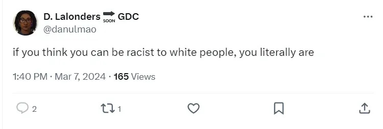 It was then discovered that Lalonders admitted to discriminating against white people while hiring for her game ValiDate. During a presentation for the Game Devs of Color Expo 2021, she said, “ValiDate has a team of all people of color. We have no white people on our team. I did that because I wanted to create a safe environment. And I know the best way for the environment to be safe is to be around people who are just like me.”