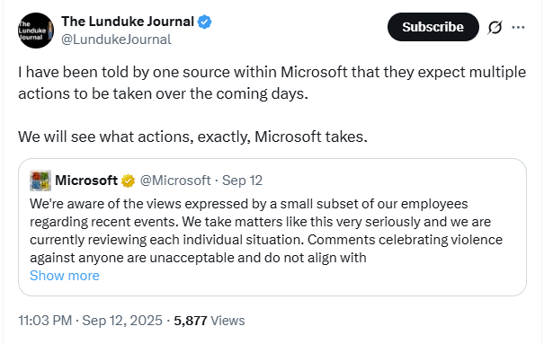 In response to this, Microsoft stated, “We're aware of the views expressed by a small subset of our employees regarding recent events. We take matters like this very seriously and we are currently reviewing each individual situation. Comments celebrating violence against anyone are unacceptable and do not align with our values.”