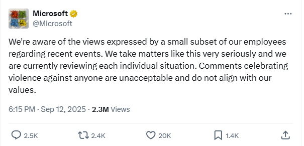 Microsoft Issues Statement Regarding Its Employees Celebrating The Assassination Of Charlie Kirk