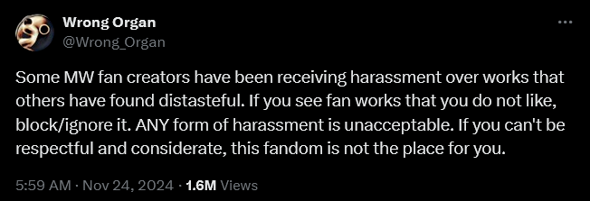 The company responded in a based way instead of apologizing, saying on X, “Some Mouthwatering fan creators have been receiving harassment over works that others have found distasteful,” wrote the developer. “If you see fan works that you do not like, block/ignore it. ANY form of harassment is unacceptable. If you can’t be respectful and considerate, this fandom is not the place for you.”
