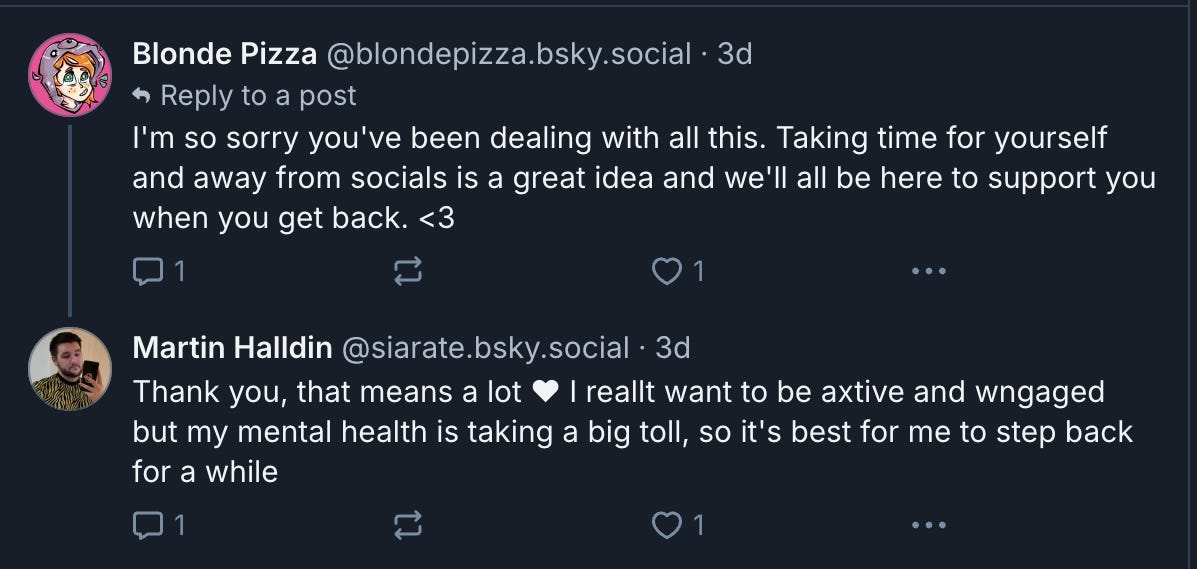 He ranted on BlueSky about the situation but deleted it, replying to one of the commenters who wished him well, “Thank you, that means a lot ❤️ I reallt want to be axtive and wngaged but my mental health is taking a big toll, so it's best for me to step back for a while”