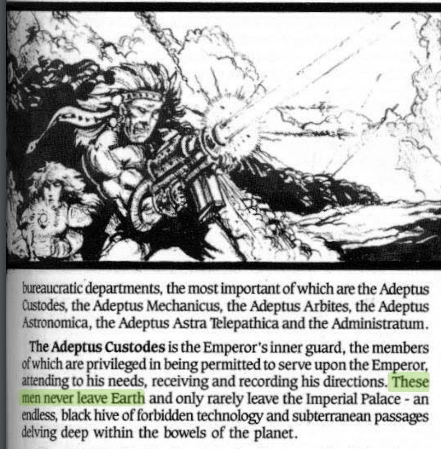 It states, “The Adeptus Custodes is the Emperor’s inner guard, the members of which are privileged in being permitted to serve upon the Emperor, attending to his needs, receiving and recording his directions. These men never leave Earth and only rarely leave the Imperial Palace – an endless, black hive of forbidden technology and subterranean passages delving deep within the bowels of the planet.”