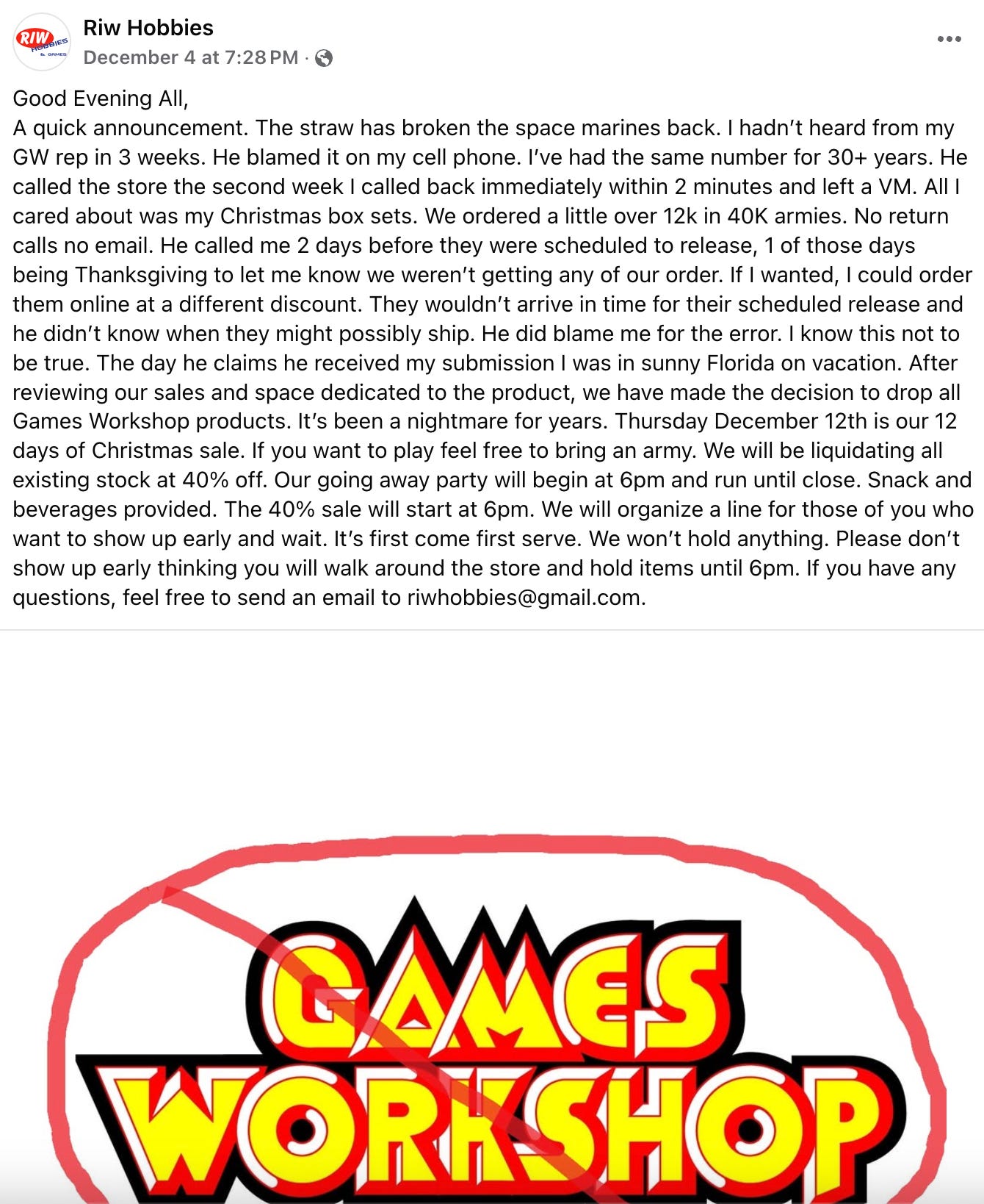 A quick announcement. The straw has broken the space marines back. I hadn’t heard from my GW rep in 3 weeks. He blamed it on my cell phone. I’ve had the same number for 30+ years. He called the store the second week I called back immediately within 2 minutes and left a VM. All I cared about was my Christmas box sets. We ordered a little over 12k in 40K armies. No return calls no email. He called me 2 days before they were scheduled to release, 1 of those days being Thanksgiving to let me know we weren’t getting any of our order. If I wanted, I could order them online at a different discount. They wouldn’t arrive in time for their scheduled release and he didn’t know when they might possibly ship. He did blame me for the error. I know this not to be true. The day he claims he received my submission I was in sunny Florida on vacation. After reviewing our sales and space dedicated to the product, we have made the decision to drop all Games Workshop products. It’s been a nightmare for years. Thursday December 12th is our 12 days of Christmas sale. If you want to play feel free to bring an army. We will be liquidating all existing stock at 40% off. Our going away party will begin at 6pm and run until close. Snack and beverages provided. The 40% sale will start at 6pm. We will organize a line for those of you who want to show up early and wait. It’s first come first serve. We won’t hold anything. Please don’t show up early thinking you will walk around the store and hold items until 6pm. If you have any questions, feel free to send an email to riwhobbies@gmail.com.”