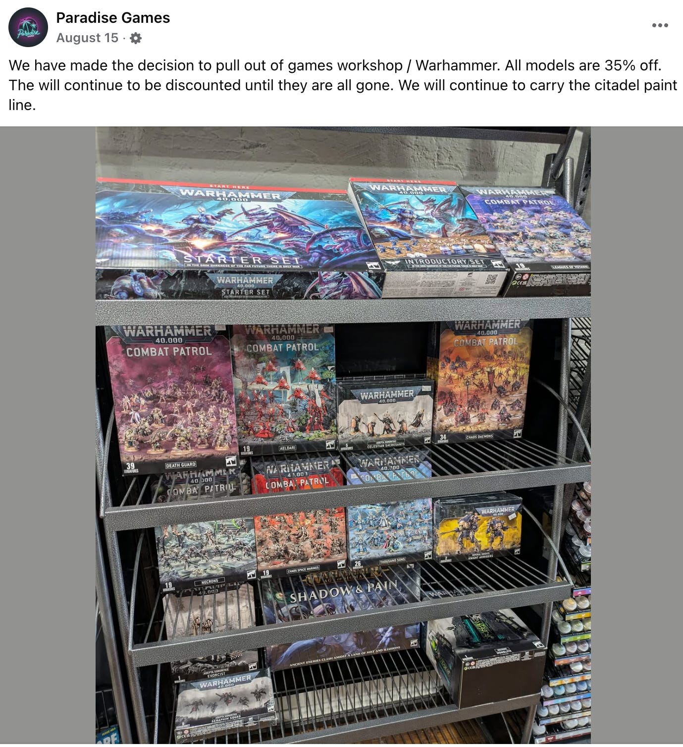On August 15th, Paradise Games announced on their Facebook, “We have made the decision to pull out of games workshop / Warhammer. All models are 35% off. The will continue to be discounted until they are all gone. We will continue to carry the citadel paint line.”