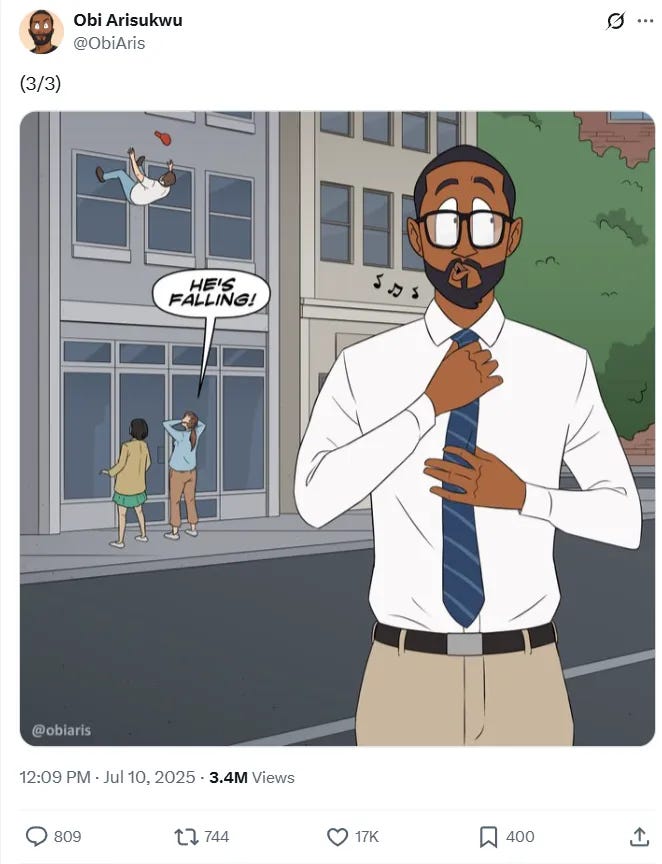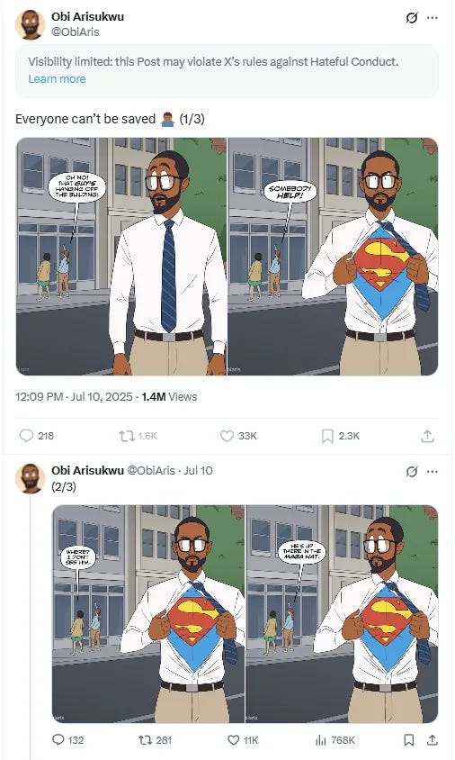 These posts come less than a week after a political cartoonist depicted a black Superman intentionally letting a civilian wearing a MAGA hat die instead of saving him. Obi Arisukwu shared his five-panel comic strip to X on July 10th and it shows a black Superman about to help a man who is about to fall off a building.