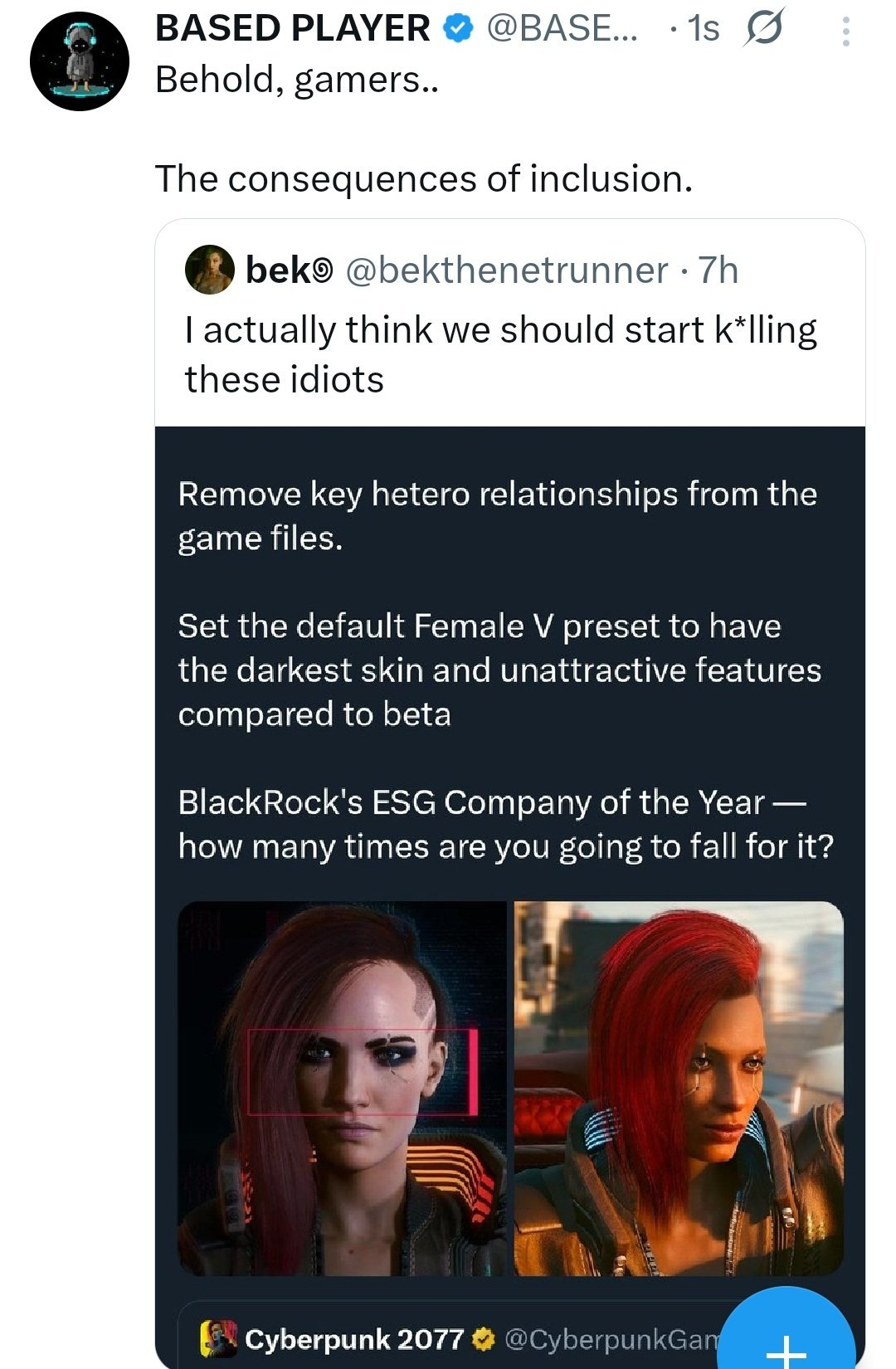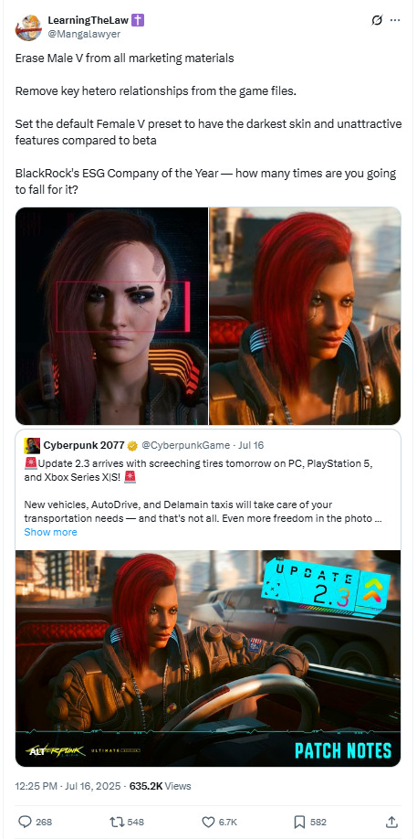 First, X user bekthenetrunner reacted to a post from Mangalawyer who recently critiqued the latest patch for CD Projekt Red’s Cyberpunk 2077. He wrote, “Erase Male V from all marketing materials Remove key hetero relationships from the game files. Set the default Female V preset to have the darkest skin and unattractive features compared to beta BlackRock's ESG Company of the Year — how many times are you going to fall for it?”