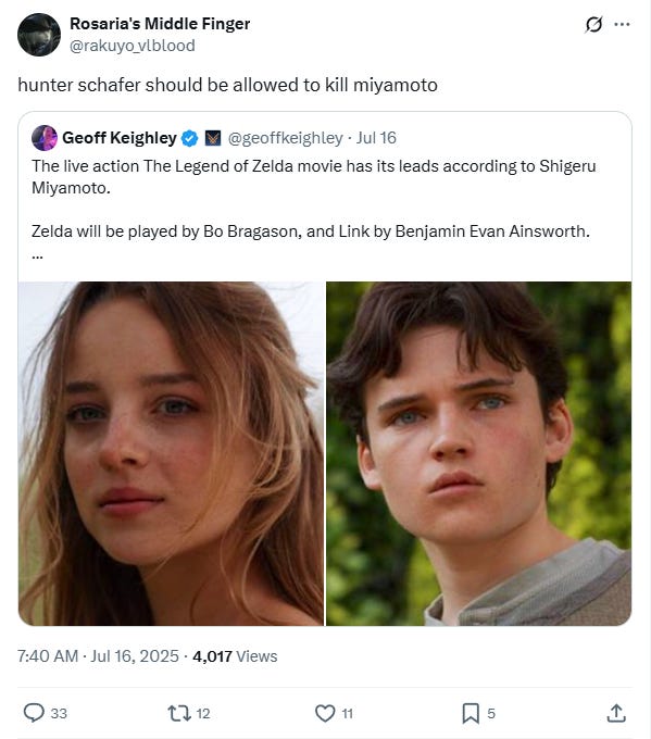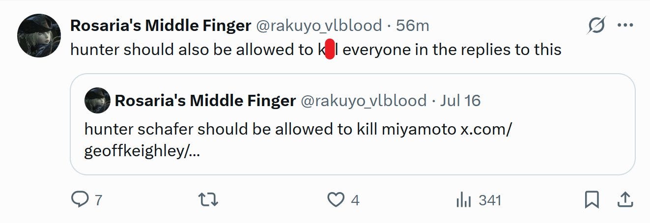 Another individual called for the death of Nintendo creator Shigeru Miyamoto in reaction to Nintendo casting Bo Bragason and not transgender activist Hunter Schafer. He wrote, “hunter schafer should be allowed to kill miyamoto.”