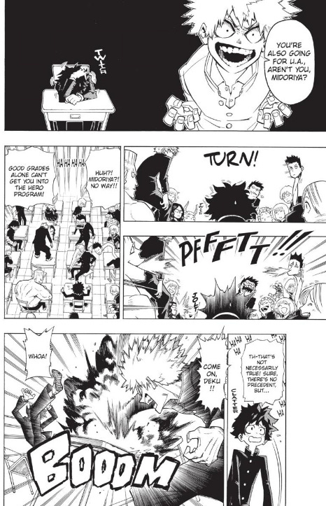 He packs a ton of world building into a single page that lays out how quirks started, how their emergence changed society, and how society is currently structured with superheroes acting as government-backed law enforcement. After that brief bit of exposition, he shows it in action as Midoriya comes across an active villain pursuit in progress. He also provides a little bit more detail on how it is actually a profession and employment is conditional based on their performance.
