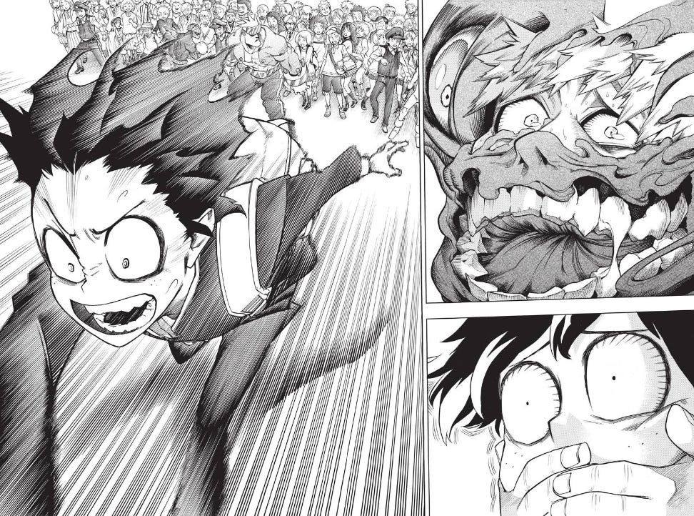 Character emotions are expertly conveyed and are quite often done so through exaggeration. Horikoshi does this to amplify various feelings like determination, anger, and sadness. It also provide moments of levity for comedic effect or can make a scene that much more serious.