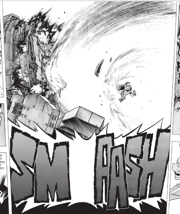 The action sequences are dynamic and explosive. He typically limits the number of panels during high-action scenes giving him more page space and he makes the best of it usually providing memorable visuals such as Deku smashing the giant robot or All Might creating a vortex to defeat the Sludge Villain.