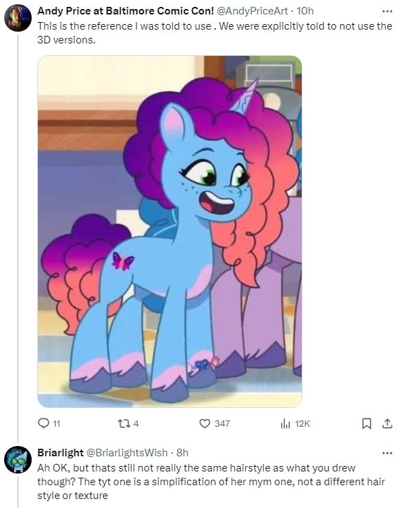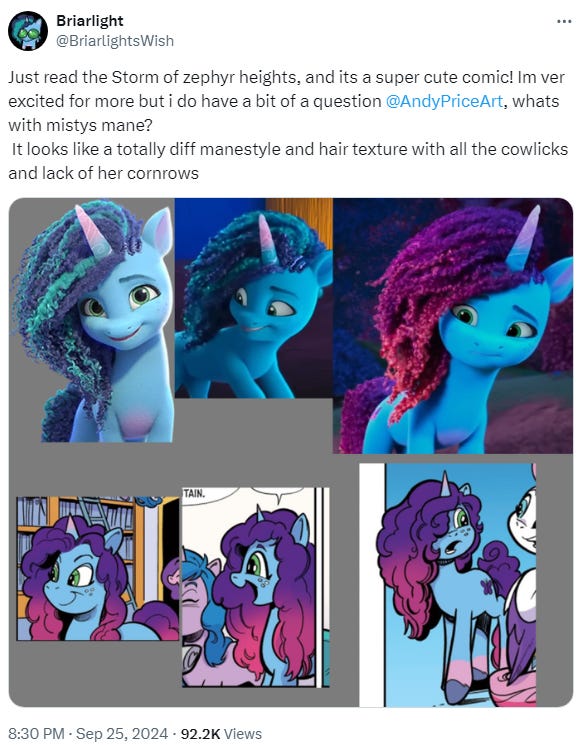 Yanzi Lin, wife of anti-SJW artist Shane Davis, creator of Inglorious Rex, posted on the matter to defend Andy Price, saying, “In the year 2024, people are bullying Andy Price (a long-time My Little Pony comic artist) for not drawing what they perceive as a black-coded pony correctly because he didn't draw afro-style hair. Hasbro mandated him to draw it otherwise, but fans like these are insufferable.”