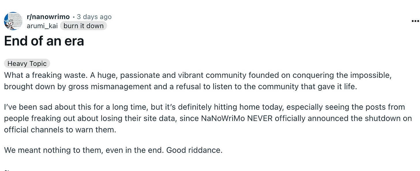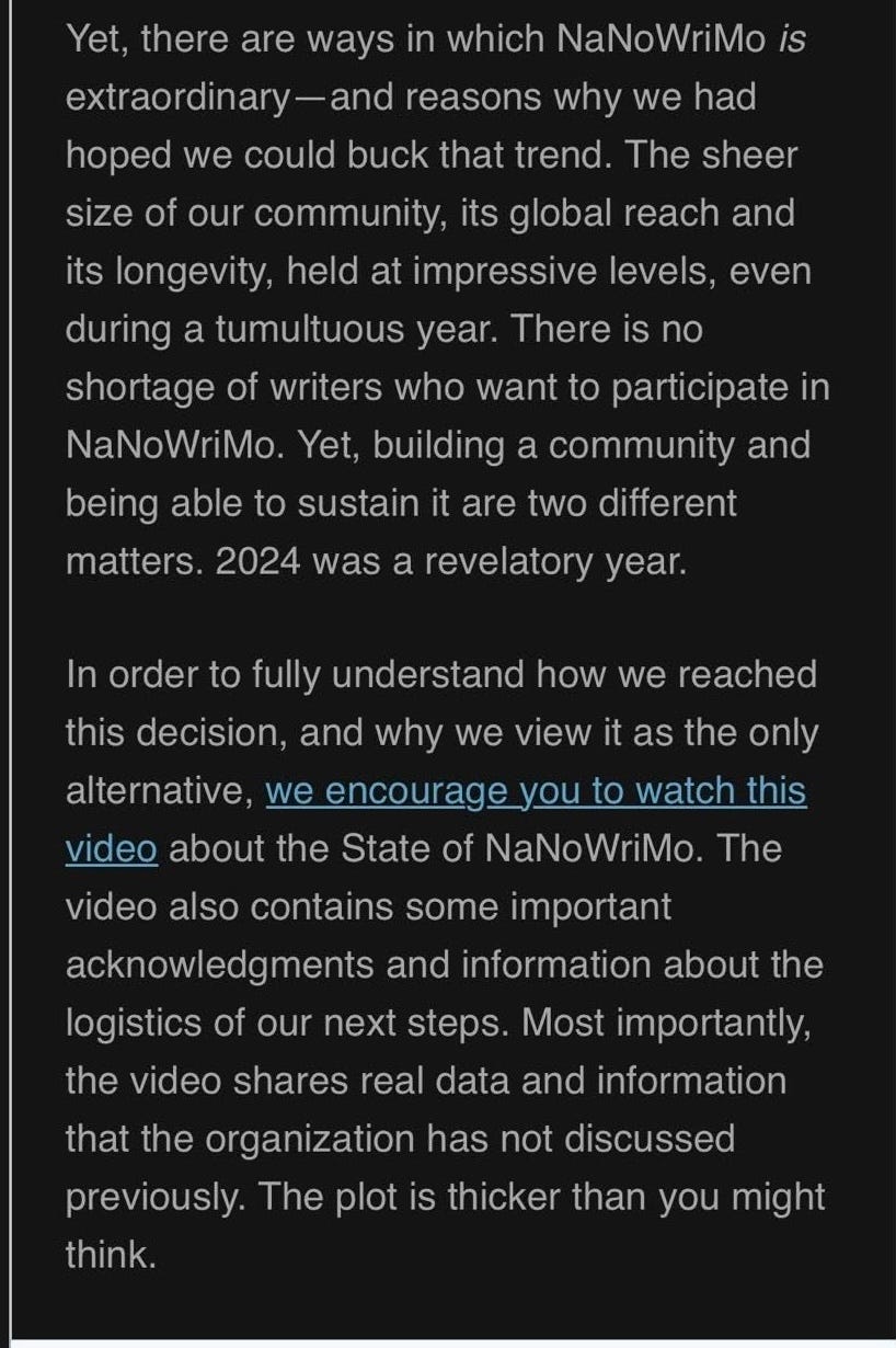 The result was a gutted NaNoWriMo in 2024 with a barely functioning forum, very few videos or articles of encouragement for writers last year, and a barely functioning tracker. Their web forum had been shut down, and the organization turned down any people who attempted to volunteer.