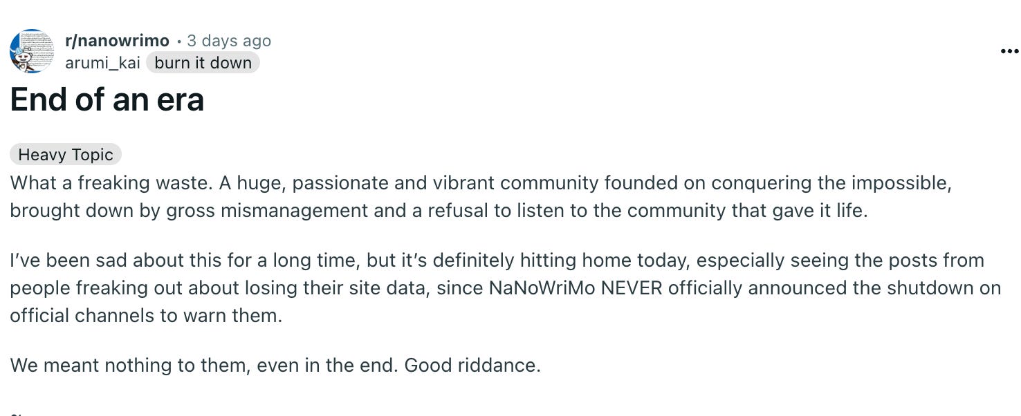 I’ve been sad about this for a long time, but it’s definitely hitting home today, especially seeing the posts from people freaking out about losing their site data, since NaNoWriMo NEVER officially announced the shutdown on official channels to warn them.