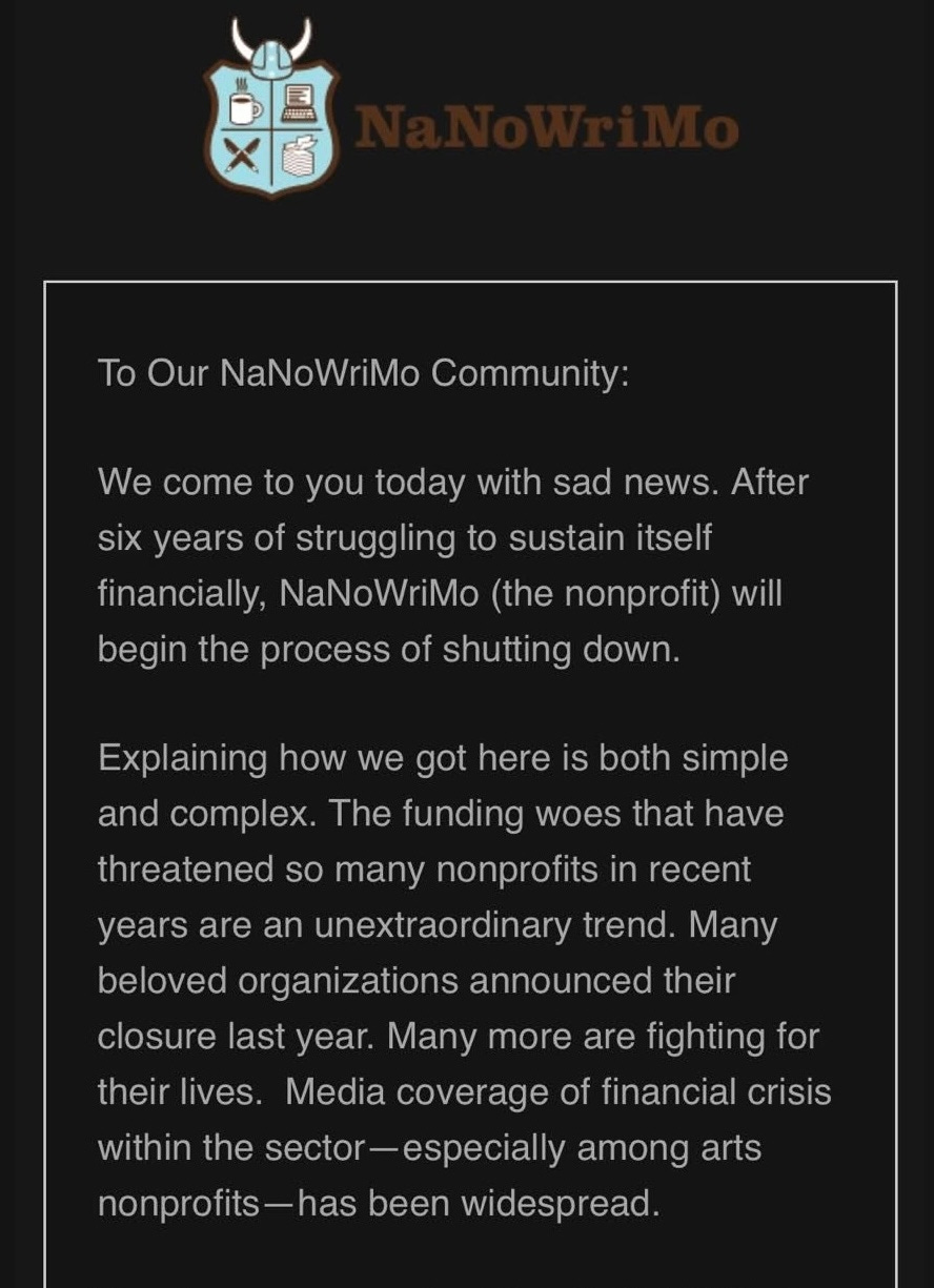 We come to you today with sad news. After six years of struggling to sustain itself financially, NaNoWriMo (the nonprofit) will begin the process of shutting down.
