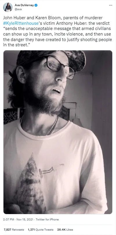 She wrote on X, “John Huber and Karen Bloom, parents of murderer #KyleRittenhouse’s victim Anthony Huber: the verdict ‘sends the unacceptable message that armed civilians can show up in any town, incite violence, and then use the danger they have created to justify shooting people in the street.'”