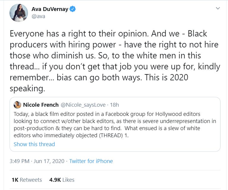DuVernay wrote, “Everyone has a right to their opinion. And we – Black producers with hiring power – have the right to not hire those who diminish us. So, to the white men in this thread… if you don’t get that job you were up for, kindly remember… bias can go both ways. This is 2020 speaking.”