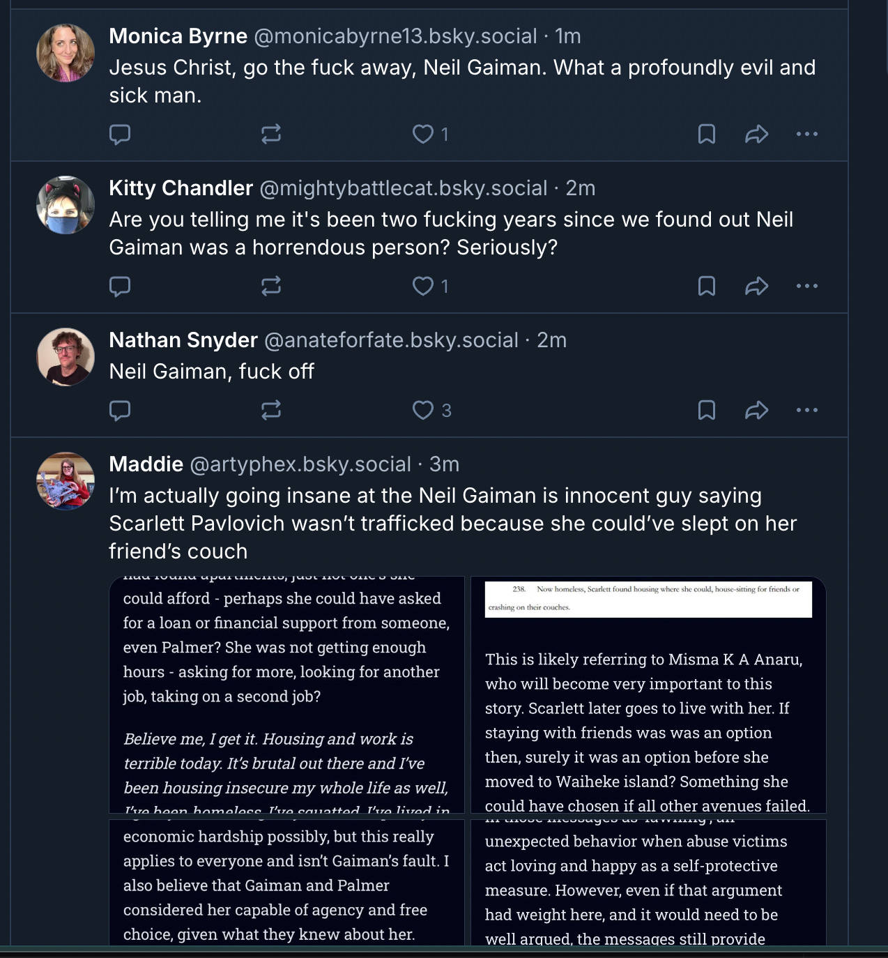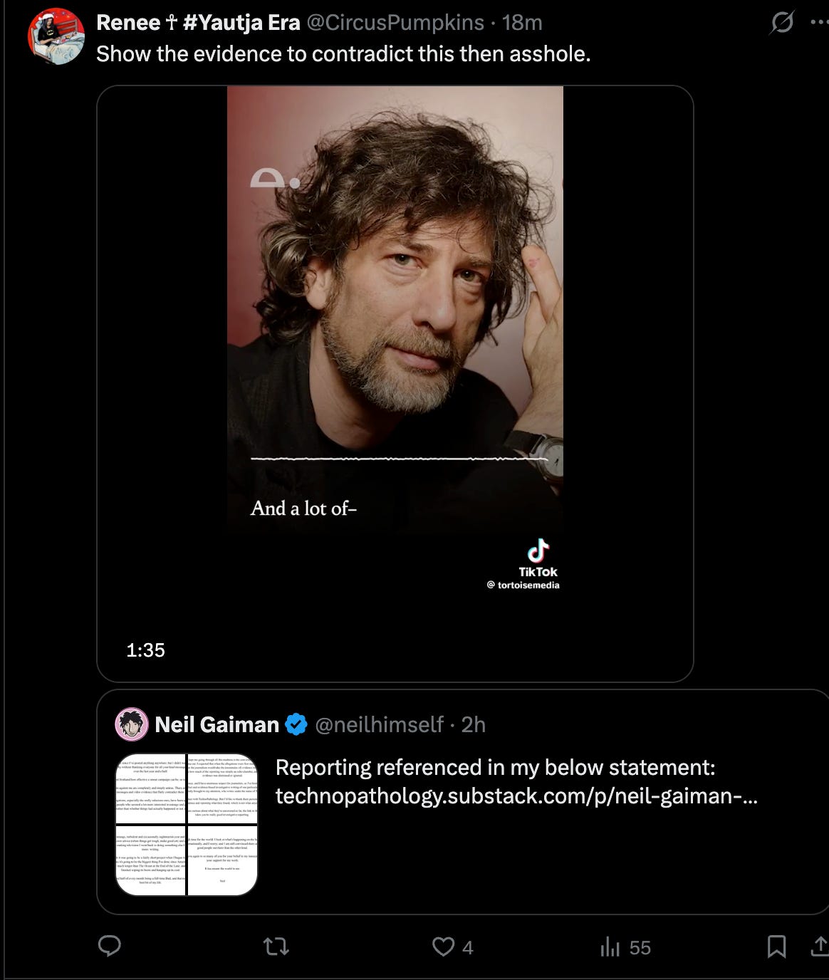 Neil claiming he’s just being a good dad through this whole situation is quite the turn of events when he was definitely cheating on his wife in creepy circumstances under the most generous of interpretations of what happened. He also linked to a Substack that calls itself the “Neil Gaiman Is Innocent Project,” a Substack that routinely attacks Gaiman critics with conspiracy theories and begs for donations.