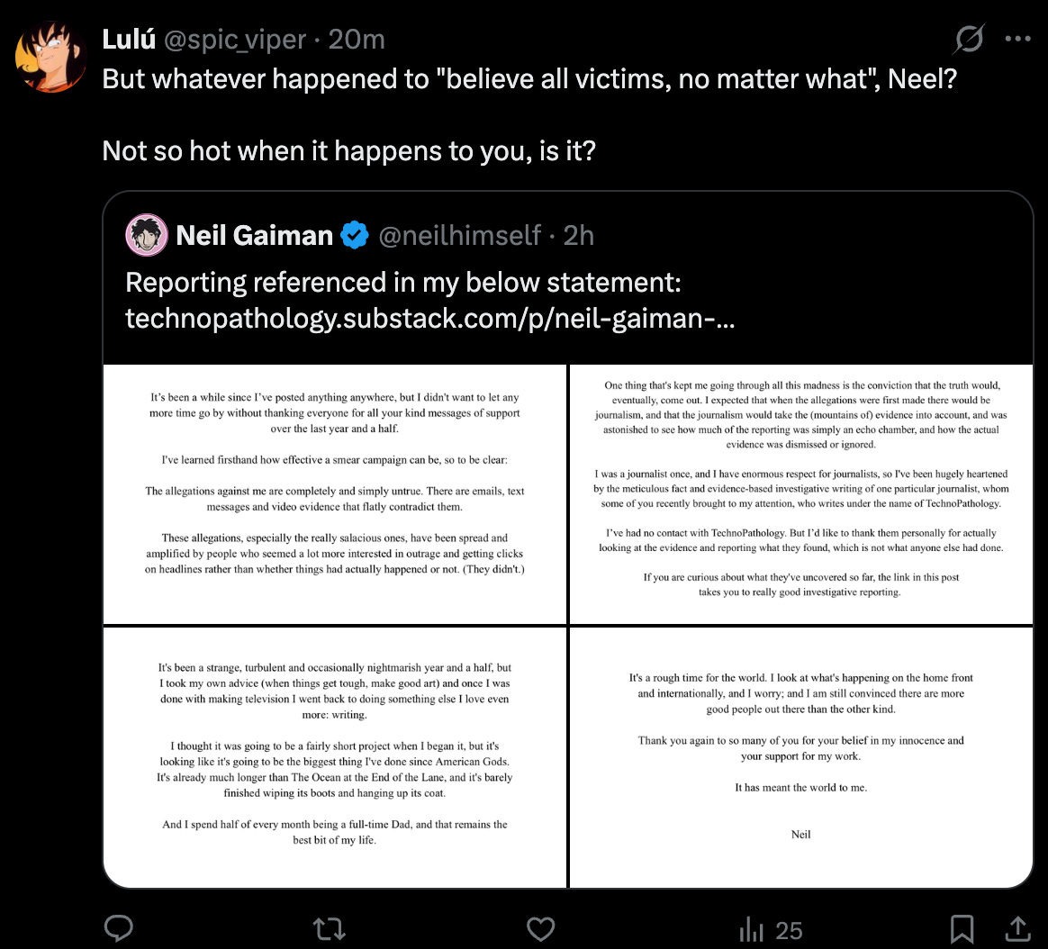 The last of which refers to multiple posts in the past Gaiman made virtue signaling to believe all female victims:
