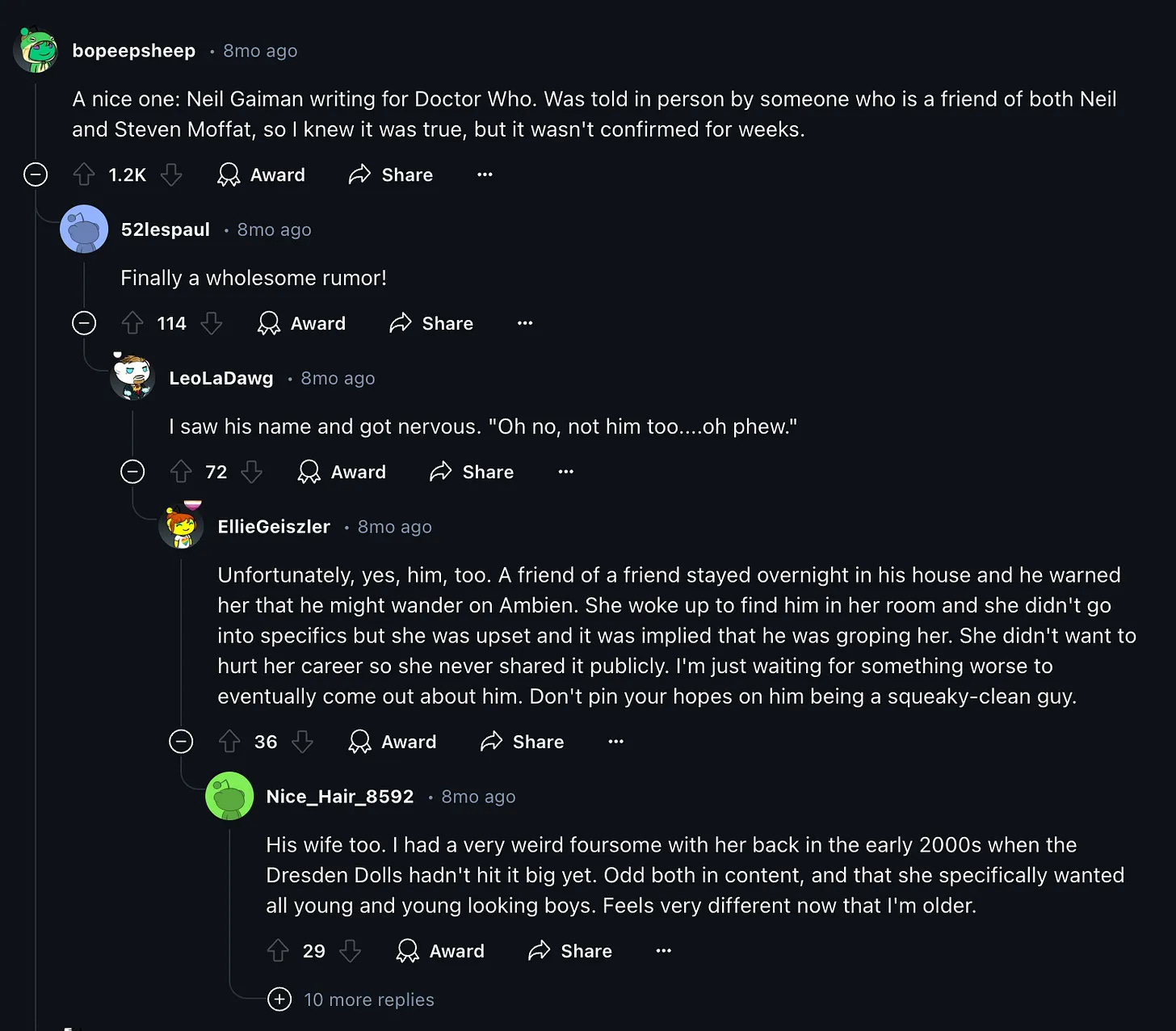 The first woman, Scarlett Pavlovich, eventually filed a civil lawsuit against Gaiman about the situation, which was thrown out of court last year not because of his innocence, but on jurisdictional grounds. Others have received hush money, such as the wife of the former groundskeeper who spoke out despite the NDA she was made to sign by the author to get her hundreds of thousands of dollars in compensation.
