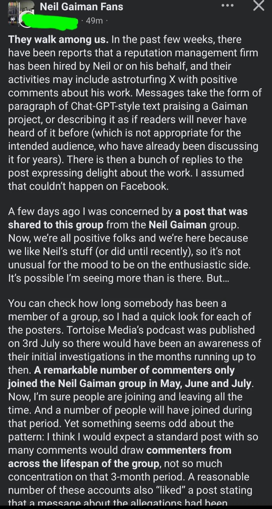 The Reddit post on Neil Gaiman Uncovered reveals that a Gaiman Facebook group had a surge of new members related to the timing of the campaign and that this was occurring before the Tortoise podcast release. One Reddit user posted, “The interesting note to me was that these apparent bots started in May, approx TWO MONTHS before the podcast launch. Neil's team appear to have started damage control as soon as they got wind of the story about to break (I imagine when Tortoise reached out for comment).”