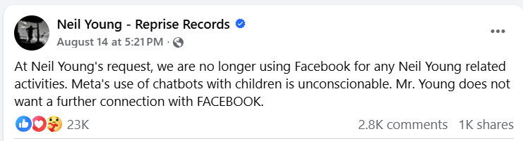 A post to Young’s official Facebook page states, “At Neil Young's request, we are no longer using Facebook for any Neil Young related activities. Meta's use of chatbots with children is unconscionable. Mr. Young does not want a further connection with FACEBOOK.”